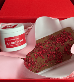 El yapımı, ahududu parçacıklı sütlü çikolata;